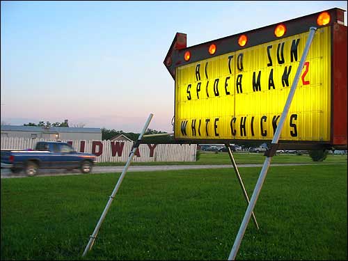 The marquee at the Midway Drive-In alerts visitors to what's playing on the outdoor screen. The Midway is one of only eight surviving drive-ins in a state that once supported more than 100 such theaters.