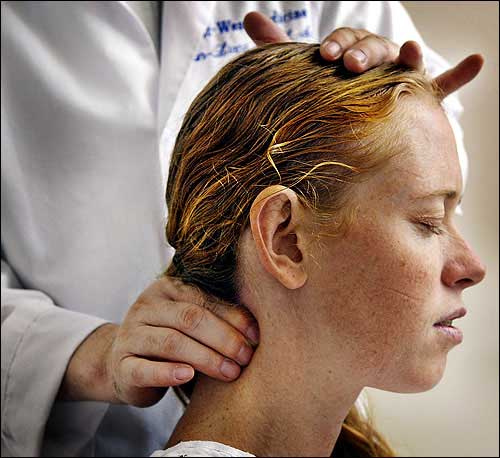 Brandi Hugo, who has suffered from a chronic inflammation, credits her improvement primarily to massage therapy. Dr. Jun Liang Yu conducts massage therapy on Hugo to help speed recovery and relieve pain at the University of California-Los Angeles Center for East-West Medicine in Santa Monica, Calif.