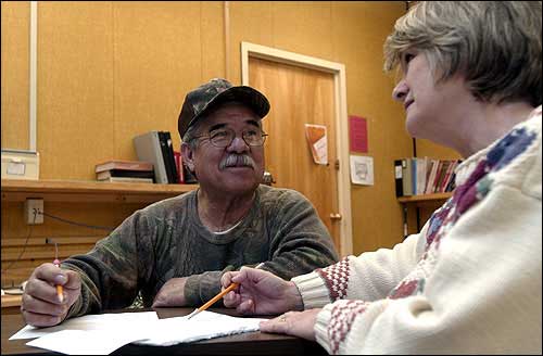 Genaro Fernandez, left, reviews a writing exercise with instructor Nancy Guy at the Adult Education center. Fernandez is studying for his GED exam.
