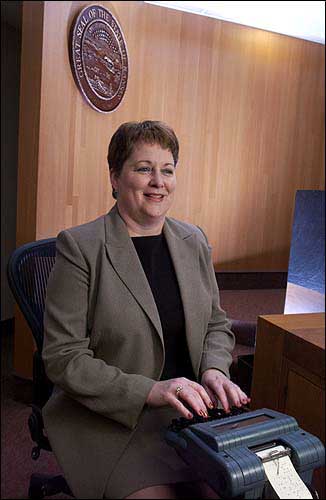 Debbie Oakleaf, president of the Kansas Court Reporters Assn., works at her post in the Douglas County District Court. Oakleaf can write at speeds of 225 words a minute.