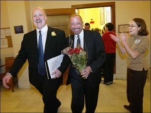 Rich Walker, left, and Brad Chilcoat are applauded after receiving their marriage license at City Hall in San Francisco. In a political challenge to California law, city authorities continue to issue more same-sex marriage licenses; however, so many were requested Sunday that officials had to turn away couples.