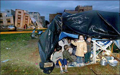 A family takes shelter under a plastic tent after their home was destroyed in Im Zourem, Morocco, during an earthquake. Tuesday's temblor, which struck while most people were sleeping, killed at least 560 people.