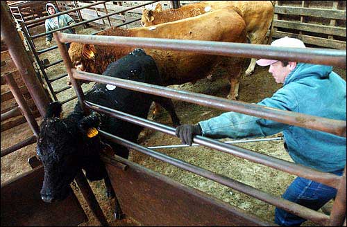 Ron Neilson, Lyndon, tries to block a calf's exit while separating cattle for auction at the Overbrook Livestock Sale Barn. Monday's auction had considerably fewer cattle than usual, with some farmers concerned about lower prices because of the effect of the mad cow case on the U.S. beef market.