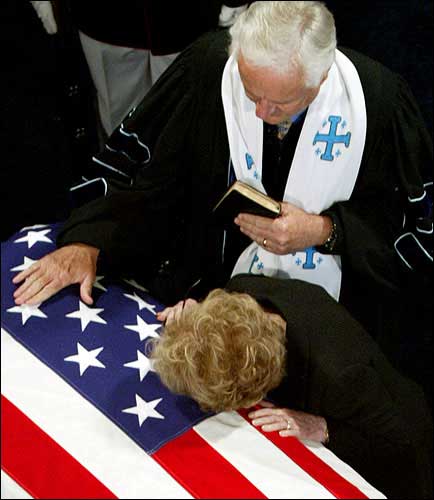 Nancy Reagan leans down to kiss the casket of her husband, former President Ronald Reagan, after a private service with her family and the Rev. Michael Wenning, before the public viewing period began at the Ronald Reagan Presidential Library in Simi Valley, Calif. A state funeral is planned for Friday.