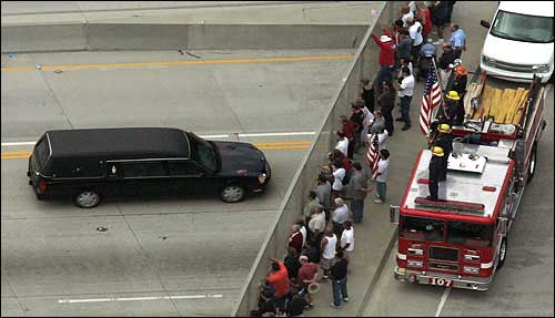 From a bridge over the 118 Ronald Reagan Freeway in Simi Valley, Calif., members of the Los Angeles City Fire Department salute along with members of the public as the hearse carrying the body of former President Reagan passes by. Reagan's body was being taken to lie in repose at the Reagan Library in Simi Valley.