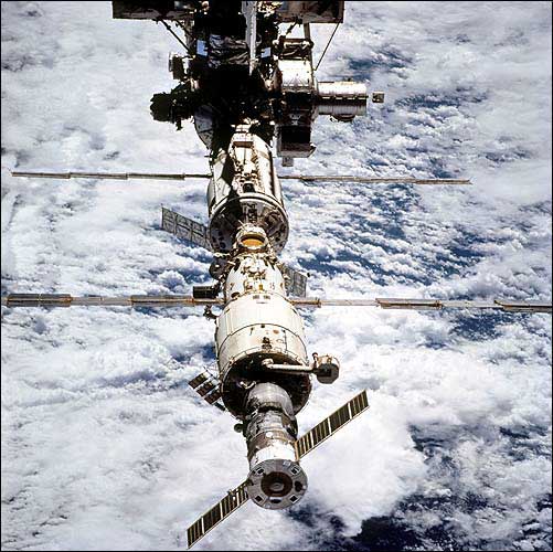 Backdropped by a blue and white Earth, the international space station is seen June 15, 2002. Two astronauts who stepped out of the international space station Thursday for an unusually risky spacewalk were quickly ordered back in when Mission Control spotted a pressure drop in one of the men's oxygen tanks.