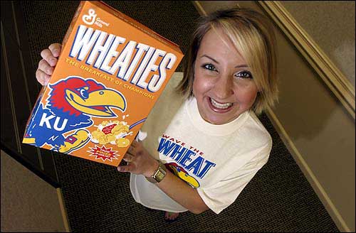 Kansas University sophomore Kellie Robertson, from Hugoton, shows off a commemorative Wheaties box decorated with a Jayhawk. The KU Alumni Association and General Foods have teamed in a promotion to sell 2,500 of the boxes, which contain a 0Wave