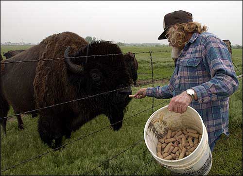 Gary Chaput, ranch manager at the L.C.L. Buffalo Ranch in Clifton, feeds Junior, a 2,000-pound buffalo, by hand in this 2003 file photo. Don Carbaugh, a former buffalo rancher, was disappointed to see the animal's horns pointing the wrong way in the depiction on one of the state quarter proposals.