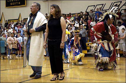 South Junior High principal Russell Blackbird and Rene Carey Cummings perform a tribal dance at the beginning of a ceremony honoring the return of Cummings, a veteran of the war in Iraq and a former South Junior High student. Friday's assembly at the school also featured the presentation of American Indian gifts.