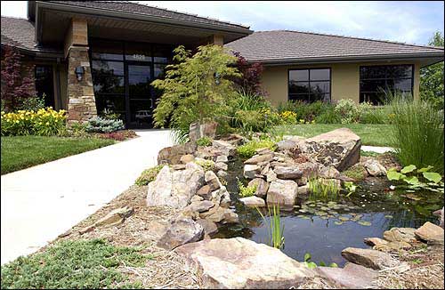 The landscaping at Dr. Daniel Ranjbar's office at 4828 Quail Crest Place is one of 10 displays at Lawrence businesses slated to receive a Lawrence Commercial Landscape Award from the Extension Master Gardeners of Douglas County. The office's landscape, pictured Friday, features a goldfish-filled lily pond.