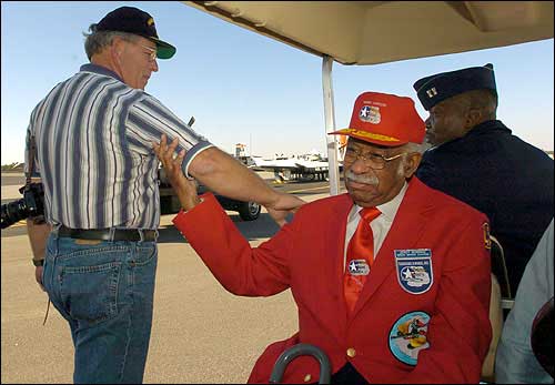 Karl Miller, left, of Manning, S.C., thanks Tuskegee Airman Leroy Bowman for his service to the United States, at the Celebrate Freedom Air & Ground Show at Woodward Airport in Camden, S.C. This year marks the 60th anniversary of the creation of the Tuskegee Airmen, an advanced combat training program for the black airmen at a small Army Air Force base in Walterboro, S.C.