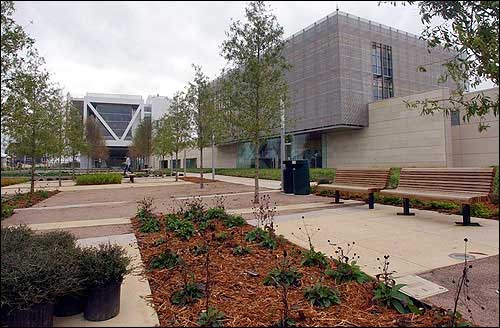 The Archive Building, right, of the Clinton Presidential Center and Library is shown next to the Scholars' Garden at the site near downtown Little Rock, Ark. Dedication ceremonies for the library are scheduled for Thursday.