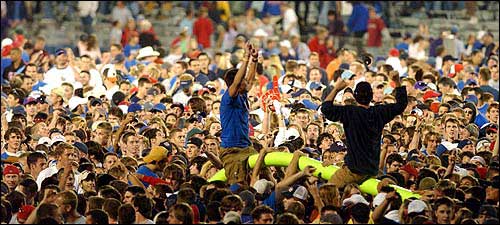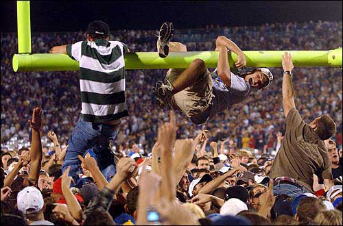 KU officials preparing to collapse the goalpost in the south end zone instead had to run for cover after the last play. The post at the north end zone was taken down, but it still was damaged beyond repair after the students got their paws on it.