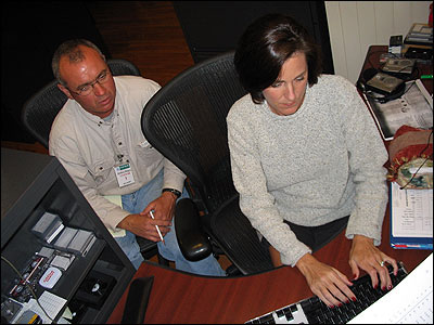 Douglas County Commissioner Jere McElhaney, left, dictates his responses to typist, Bobbie Flory, during an online chat with voters at the News Center Monday.