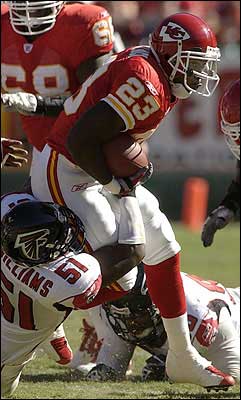 Kansas City running back Priest Holmes (31) leaps into the end zone over Atlanta defenders Matt Stewart and Siddeeq Shabazz (26) in the second quarter. Holmes and Derrick Blaylock each rushed for four touchdowns Sunday in the Chiefs' 56-10 rout of the Falcons at Arrowhead Stadium in Kansas City, Mo.