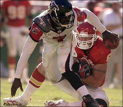 Kansas City's Derrick Blaylock (23) is tackled by Atlanta linebacker Demorrio Williams.