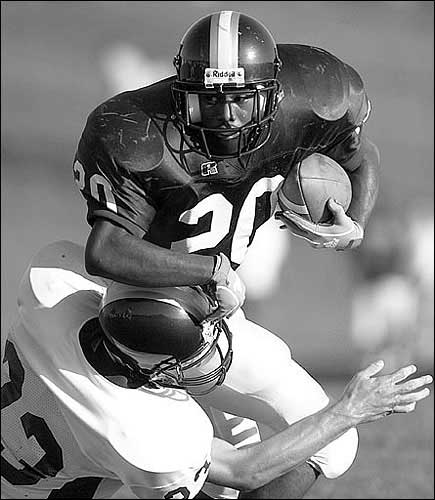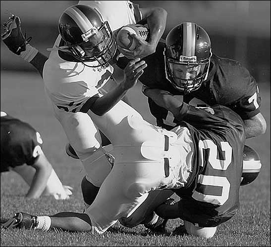 Free State running back Dennis Patton, top left, is stopped by defenders Brian Murphy (20) and Ricky Lockner during the FSHS fall sports jamboree.
