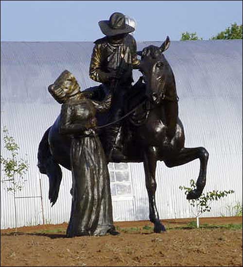 Officials in Kiowa, with a population today of about 1,100, accepted Tucker’s offer of the statue, land and construction of a park, City Administrator Mark Skiles said. The life-size bronze, 10 feet tall at its highest point, is of a man on horseback and a woman handing him a wooden stake. It stands at Fourth and Main streets on land where Tucker’s brother, Dale, once operated a family business.