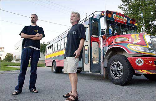 Jim Craig, left, and Michael Jones talk beside the chicken bus they drove from Guatemala to Lawrence. The bus was originally a school bus from Perry before it made the journey to Guatemala to be retrofitted into a chicken bus. The pair drove the bus here to be sold on eBay.