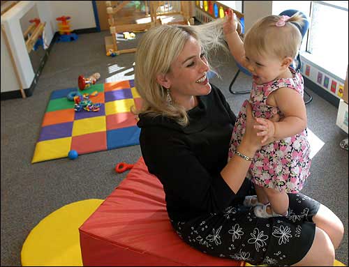 Kirstie Foster, a corporate public relations manager with General Mills, pays a visit to her 10-month-old daughter, Mia, in the day-care facility at the company's headquarters in Golden Valley, Minn. Foster played with her daughter on Sept. 20. General Mills is on Working Mother magazine's 19th annual list of the 100 best companies for working mothers.