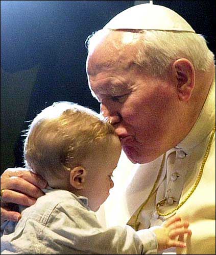 Pope John Paul II kisses an unidentified baby at the end of a general weekly audience in the Pope Paul VI Hall at the Vatican, Wednesday, March 14, 2001.