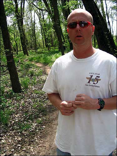 Neil Taylor, trail coordinator for the Lawrence Mountain Bike Club, describes the problem of motorcyclists riding on bicycle trails along the Kansas River levee. In recent days motorcycles caused nearly 9,000 damage to the trails.