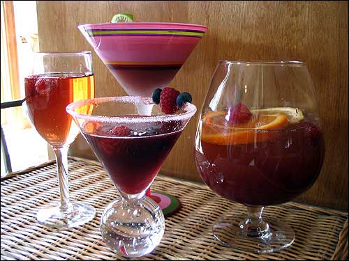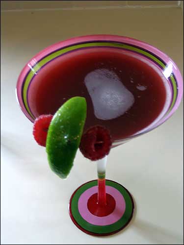 Rub two raspberries (smashing them) around the bowls or two frozen martini glasses.