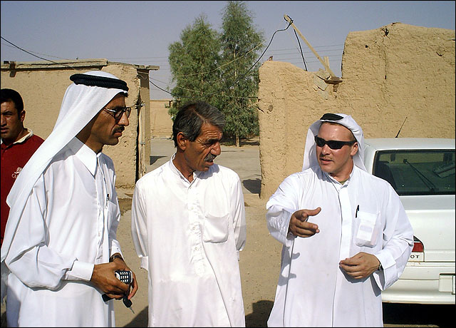 U.S. Army Staff Sgt. Dale L. Horn, right, of Fort Walton Beach, Fla., speaks with Dr. Mohammed Ismail Ahmed, a local sheik, left, and a villager in Ojba, Iraq. Horn was made an honorary sheik for his efforts to help villages in his patrol's area.