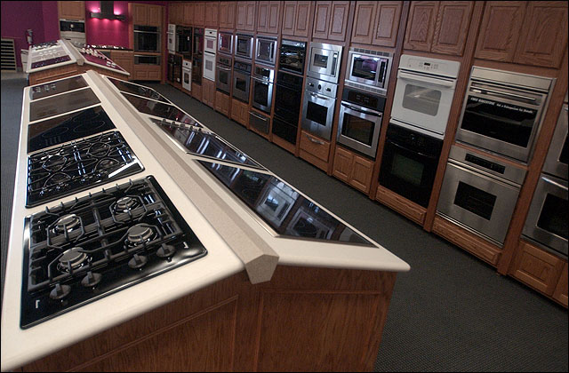 The new place features 11 “vignette” displays, showing how specific products would look in a coordinated kitchen; an entire wall of wall ovens; and a demonstration kitchen where guest chefs will be invited in to show their stuff on products offered in store for sale.