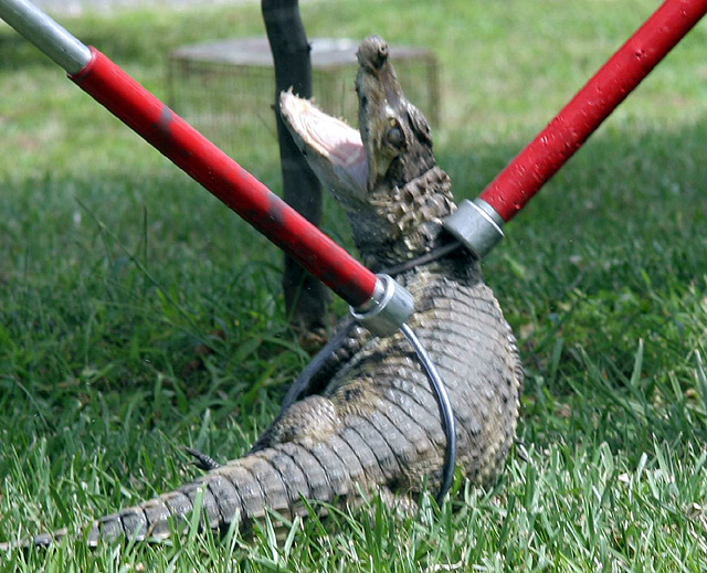 A 30-inch caiman, snared by officers from Animal Control, was found on the lawn at 1311 Wagon Wheel Drive, where a day care operates.