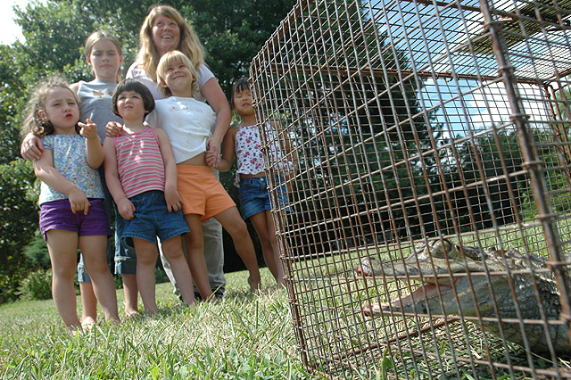 Shelly Davis holds back children in her day care from left, Raegan Godley, 4, Kitty Tootle, 11, Olivia Rice, 4, Aubin Murphy, 5, and Kate Rettig, 6, as they look at the captured caiman found on Davis' lawn Tuesday at 1311 Wagon Wheel Drive.