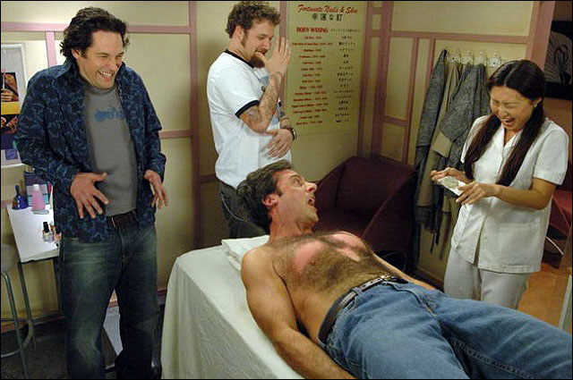 Former Kansas University student Paul Rudd, left, Seth Rogen and Miki Mia help Steve Carell, below, remove his chest hair in The