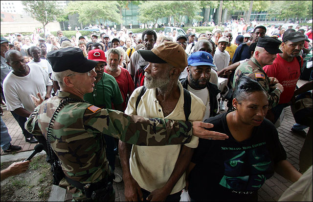 A Louisiana National Guardsmen holds back residents as they gather outside the Louisiana Superdome in New Orleans on Sunday. The Superdome opened Sunday to residents of New Orleans who are seeking shelter from Hurricane Katrina, which is expected to make landfall today.