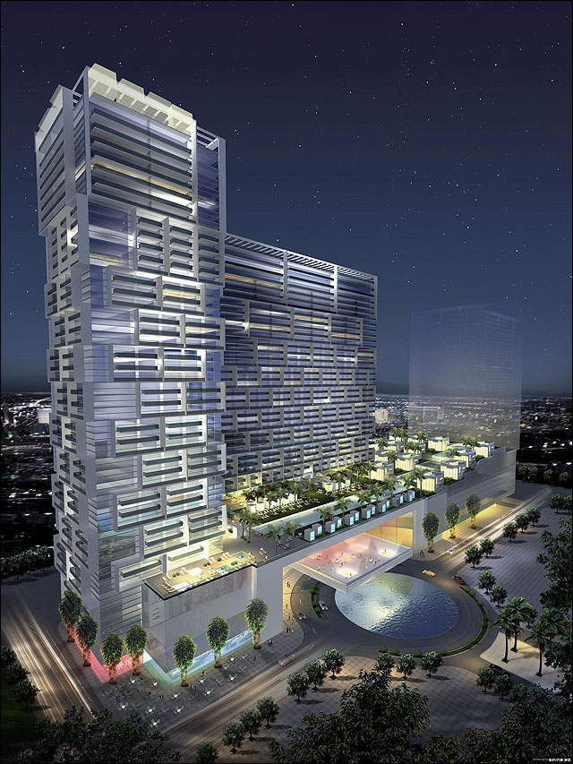 This conceptual image supplied the developers of Las Ramblas shows a proposed condo-hotel which would be part of phase one of Las Ramblas, a new world-class hotel, condominium and casino development in Las Vegas, which actor George Clooney announced Monday that he has invested in. The opening phase will include a tower of approximately 556 condo-hotel units and a building containing a 300-room hotel with 370 additional condo-hotel units, center background. Construction of phase one begins in mid 2006, with expected completion in early 2008.