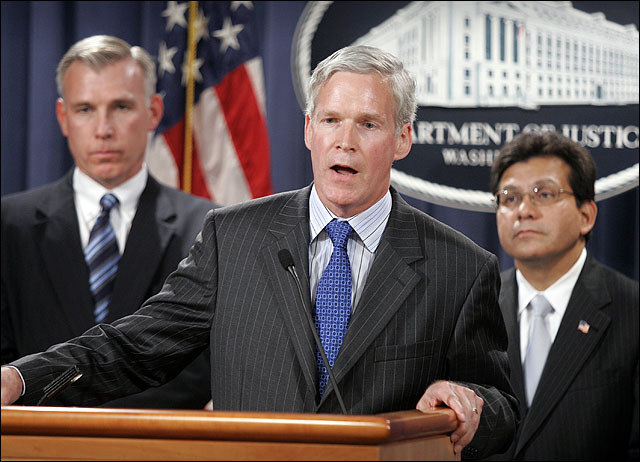 Internal Revenue Service Commissioner Mark Everson, center, discusses the indictment of nine individuals and the criminal wrongdoing of KPMG, which has agreed to pay 56 million in fines, restitution and penalties as part of an agreement to defer prosecution of the firm. Also at Monday's press conference, are David Kelley, left, U.S. Attorney for the Southern District of New York, and U.S. Atty. Gen. Alberto Gonzales.