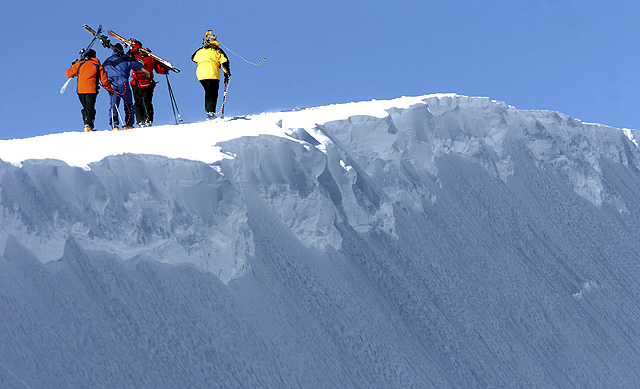 Participants in the Ski Utah Interconnect Adventure tour cross a ridge as they leave the Deer Valley Resort and begin their descent into backcountry skiing areas. The all-day tour gives visitors the opportunity to try several different ski areas as well as multiple backcountry skiing locations before day's end.