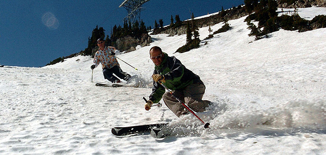 Utah ski industry officials Eric Thompson, left, and Nathan Rafferty ski down a slope at the Snowbird Ski & Summer Resort.