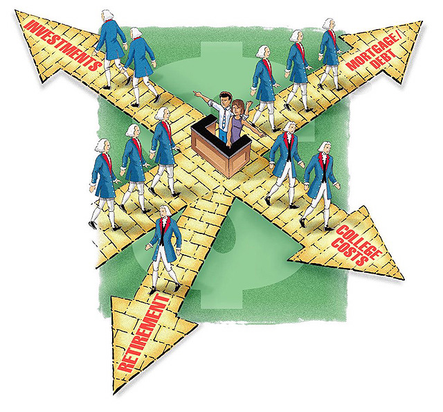 Size as needed (160 dpi, 38p x 35p) Hiram Henriquez color illustration of couple directing George Washington figures (representing dollars) down paths toward Investments, Mortgage Debt, College Costs, Retirement. Can be used with stories about financial planning. Miami Herald 1997 CATEGORY: ILLUSTRATION SUBJECT: Finances illus ARTIST: Hiram Henriquez ORIGIN: Miami Herald TYPE: EPS JPEG SIZE: As needed ENTERED: 1/21/97 STORY SLUG: Stand-alone illustration, business, finance, finances, saving, debt, planning, financial, mortgage, college, cost, investment, retirement, dollar, MI, 1997, henriquez