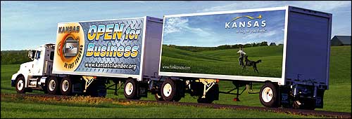 Yellow Roadway Corp. trailers boast the Kansas Chamber of Commerce's brand and the state's new catch phrase.