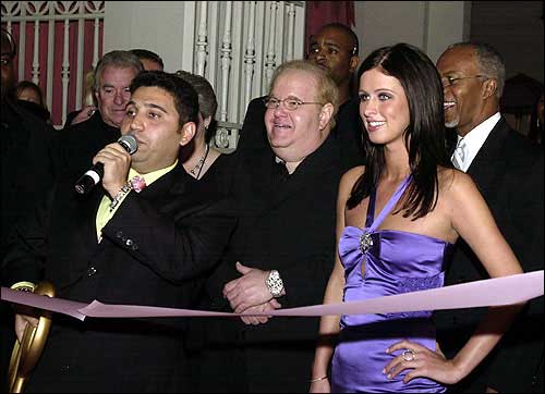 Co-owner Fred Khalilian, left, and Nicky Hilton, right, prepare to cut the ribbon to open Paris Hilton's Club Paris in Orlando, Fla. Airline problems kept Paris Hilton from arriving in time for the club's grand opening on Thursday evening.