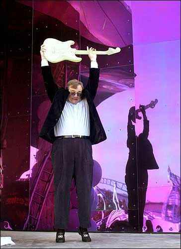 Billionaire Paul Allen lifts a Dale Chihuly glass guitar above his head before smashing it to open his 40 million Experience Music Project museum of American popular music in Seattle. The normally reclusive Allen spoke for about 5 minutes, one of his longest public speeches, to welcome a crowd of several hundred at the June 2000 grand opening.