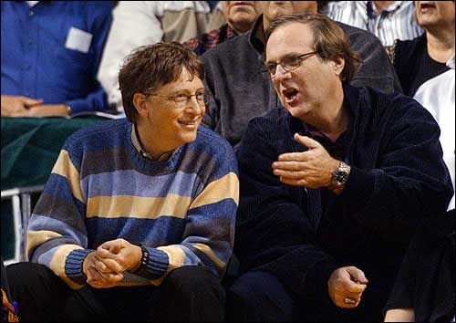 Microsoft Chairman Bill Gates, left, chats with Paul Allen, Portland Trail Blazers owner and Gates' former business partner. They visited during a 2003 game between the Blazers and Seattle SuperSonics in Seattle.