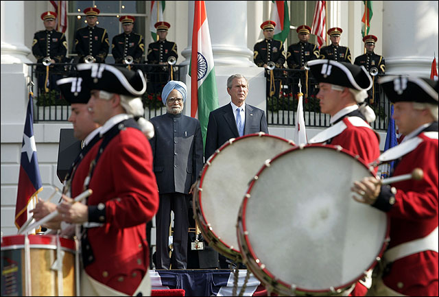 Band members wearing American Old Guard Fife and Drum Corps Revolutionary War dress uniforms march past as President Bush, center right, and Indian Prime Minister Manmohan Singh, center left, stand together during arrival ceremonies Monday at the White House. Singh is looking to complete the post-Cold War, post-9-11 repositioning of his country by entering into a strategic partnership with the United States. During a meeting Monday with Singh, Bush tried to deflect criticism that he was lowering his ethical standards regarding a posssible leak of a CIA agent's name.