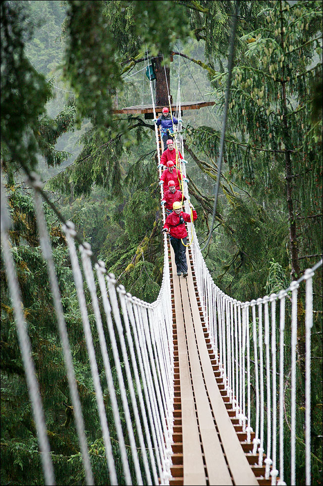 Alaska Canopy Adventures this season began offering tours of the network of suspended rope bridges and connecting zip lines stretching over three-fourths of a mile at the Alaska Rainforest Sanctuary near Ketchikan.