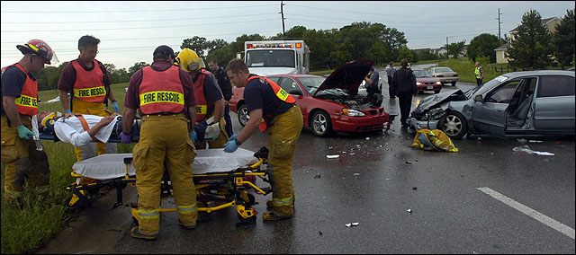 Lawrence-Douglas County Fire & Medical personnel transport a man who was seated on the passenger side of the car at right, which collided head-on with the red Pontiac at the curve connecting 31st Street with Kasold Drive. All three people involved in the accident were transported to the hospital on Friday.