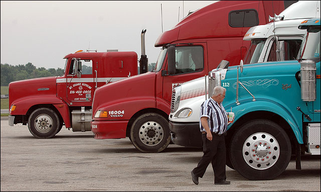 Trucks line up at the I-70 rest stop east of Lawrence, where Ralph Wheeler inspects the tires on his 18-wheeler. The federal government will require fingerprinting and a background check for truckers wanting to haul hazardous material.
