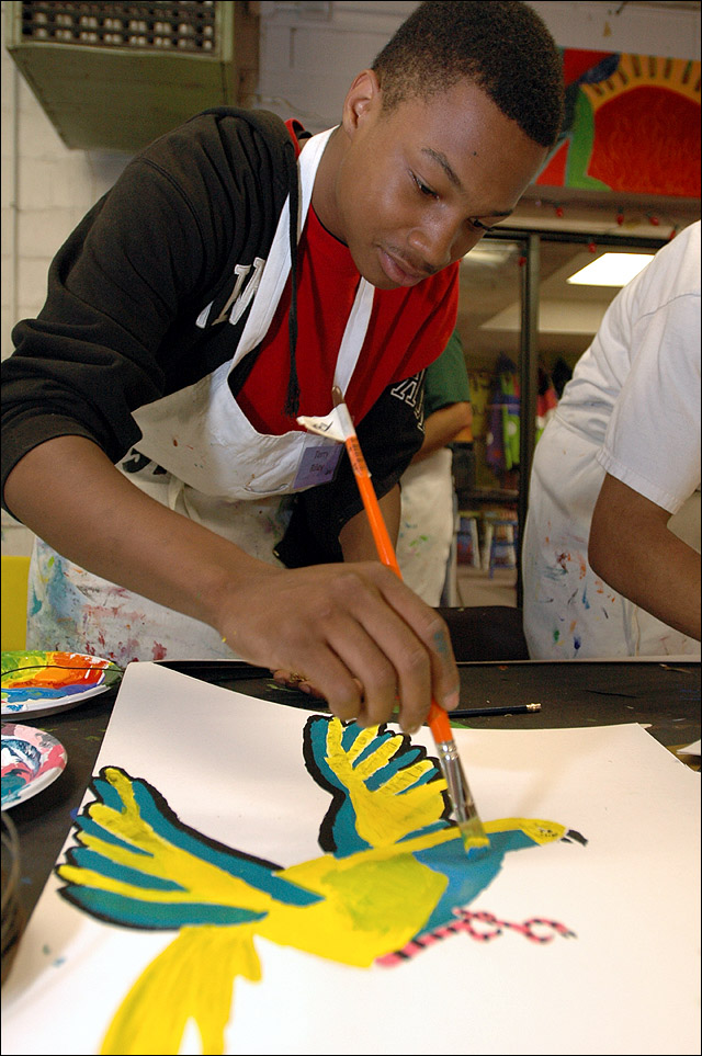 Terry Riley, a Free State High School sophomore, paints a parrot that will be used to decorate a boat for a Saturday boat parade that will benefit Van Go Mobile Arts.