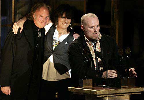Neil Young, left, joins Chrissie Hynde, center, and Martin Chambers of The Pretenders as Chambers accepts their award during the Rock and Roll Hall of Fame induction ceremony in New York.