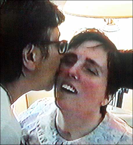Terri Schiavo gets a kiss from her mother, Mary Schindler, in this Aug. 11, 2001, image taken from videotape and released by the Schindler family. Schiavo's feeding tube was removed Friday, against the will of her parents.