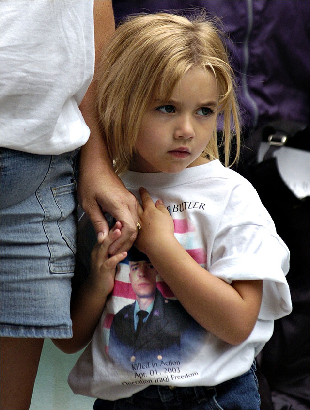 Kaitlyn Butler, 5, holds the hand of her mother, Chrissy, at the governor's Memorial Day ceremony at the Statehouse in Topeka. Members of the Butler family wore T-shirts bearing the picture of Kaitlyn's uncle, Army Sgt. Jacob Butler, the first Kansan killed in Iraq. Butler died April 1, 2003.